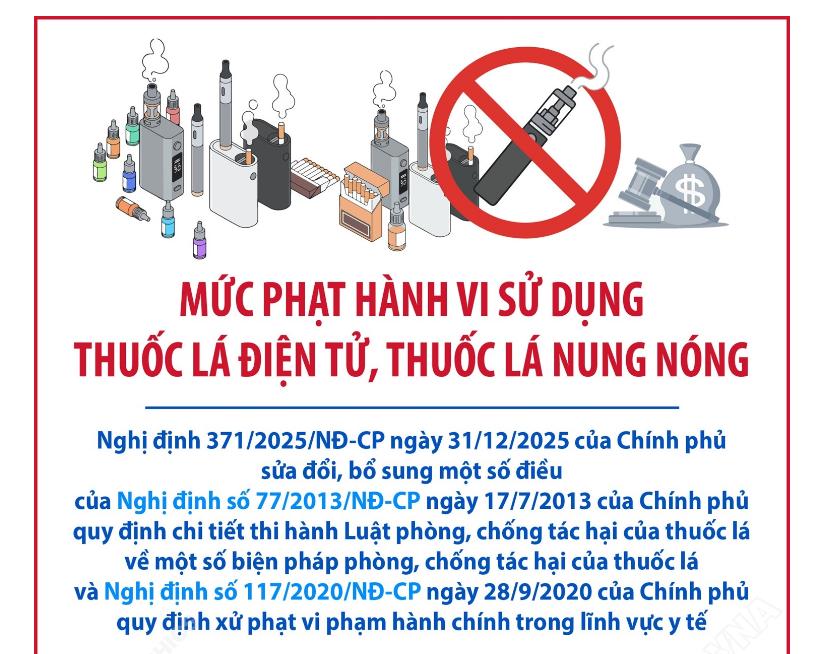 Nghị định 371/2025/NĐ-CP quy định hành vi sử dụng thuốc lá điện tử, thuốc lá nung nóng bị phạt tiền từ 3 - 5 triệu đồng và buộc tiêu hủy thuốc lá điện tử, thuốc lá nung nóng. Hành vi chứa chấp người khác sử dụng thuốc lá điện tử, thuốc lá nung nóng tại địa điểm thuộc quyền sở hữu hoặc quản lý của mình bị phạt tới 10 triệu đồng. Nghị định có hiệu lực từ 31/12/2025