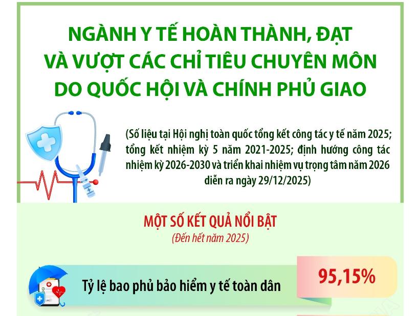 Theo Bộ Y tế, tính đến hết năm 2025, tỷ lệ bao phủ bảo hiểm y tế ước đạt 95,15% dân số, vượt mục tiêu đề ra; số bác sĩ đạt 15 bác sĩ/ 10.000 dân; số giường bệnh đạt 34,5 giường/ 10.000 dân. Tuổi thọ trung bình của người dân đạt khoảng 74,8 tuổi; tỷ lệ người dân hài lòng với dịch vụ y tế đạt hơn 90%. Nhiệm kỳ 2021-2025, các chỉ tiêu chủ yếu của ngành đều đạt và vượt kế hoạch. Đặc biệt, ngành y tế hoàn thành 3/3 chỉ tiêu chủ yếu của Kế hoạch phát triển kinh tế - xã hội năm 2025 theo Nghị quyết số 158/2024/QH15 và Nghị quyết số 192/2025/QH15 của Quốc hội và đạt 8/9 chỉ tiêu cho ngành, lĩnh vực năm 2025 được giao tại Nghị quyết số 01/NQ-CP và Nghị quyết số 154/NQ-CP của Chính phủ. Những kết quả này cho thấy sự phục hồi mạnh mẽ và nỗ lực vượt bậc của toàn ngành trong việc bảo đảm các mục tiêu chăm sóc sức khỏe nhân dân.