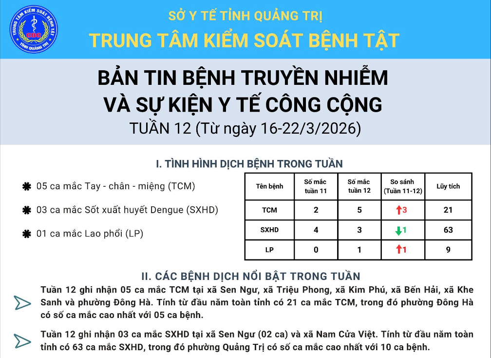 Bản tin bệnh truyền nhiễm và sự kiện y tế công cộng tuần 12 (từ ngày 16-22/0/2026)