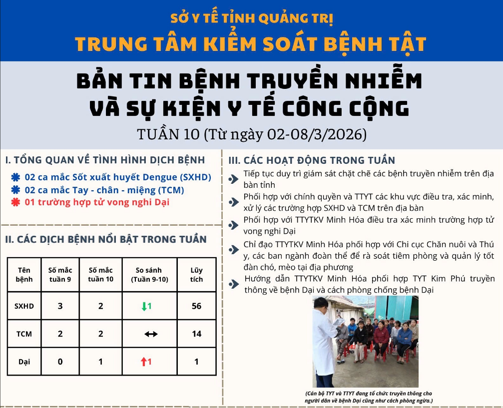 Bản tin truyền nhiễm và sự kiện y tế công cộng Tuần 10 (Từ 02-08/3/2026)