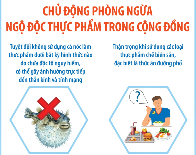 Nguy cơ ngộ độc thực phẩm tiềm ẩn trong cả thực phẩm tự nhiên và thực phẩm chế biến sẵn. Người dân tuyệt đối không sử dụng cá nóc làm thực phẩm dưới bất kỳ hình thức nào do chứa độc tố nguy hiểm, có thể gây ảnh hưởng trực tiếp đến thần kinh và tính mạng. Đồng thời, cần thận trọng khi sử dụng các loại thực phẩm chế biến sẵn, đặc biệt là thức ăn đường phố; lựa chọn cơ sở uy tín, bảo đảm điều kiện vệ sinh an toàn thực phẩm…
